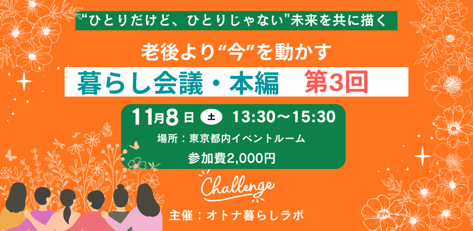 ※本ご案内は重要なお知らせのため、必ずご確認ください。 平素よりオトナ暮らしラボ「暮らし会議」にご関心をお寄せいただき、誠にありがとうございます。 この度、「暮らし会議」プレミーティング・本編申込・キャンセル待ち・次回案内希望フォーム送信で... -